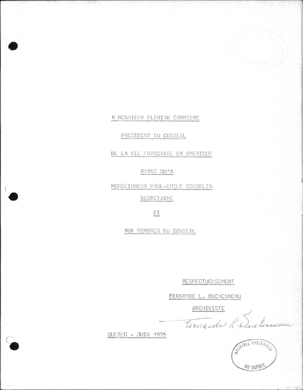 Archives du Conseil de la vie française en Amérique, Juin 1975, Archives nationales à Québec, Collection Centre d'archives de Québec, (03Q,P1000,S3,D2397).