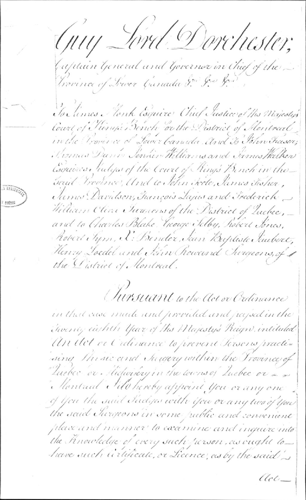 Décret de Lord Dorchester adressé aux juges et chirurgiens concernant la pratique de la chirurgie