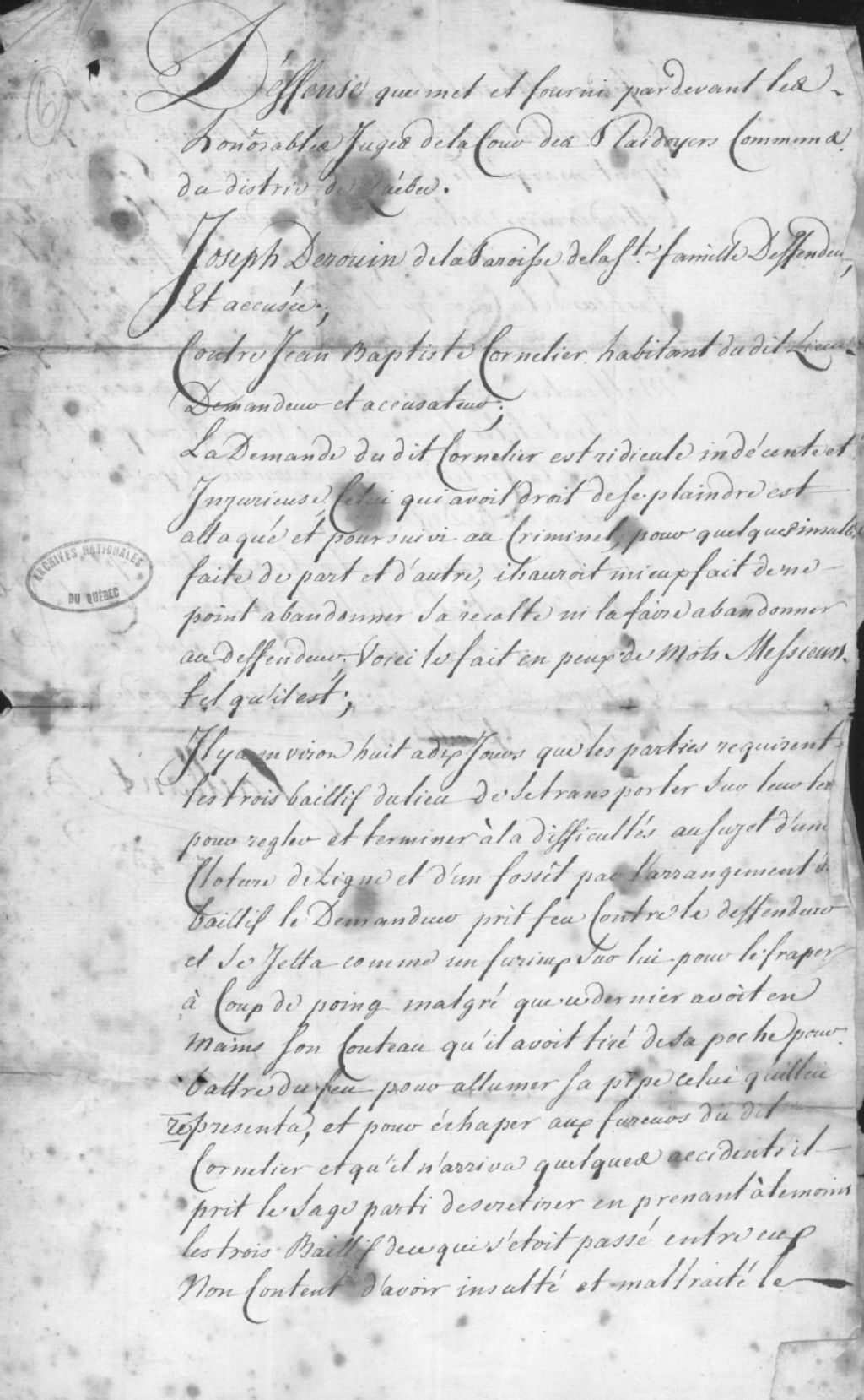 - Défense de J. Derouin présentée à la Cour des Plaidoyers communs contre Jean-Baptiste Cornelier. Signé Saillant