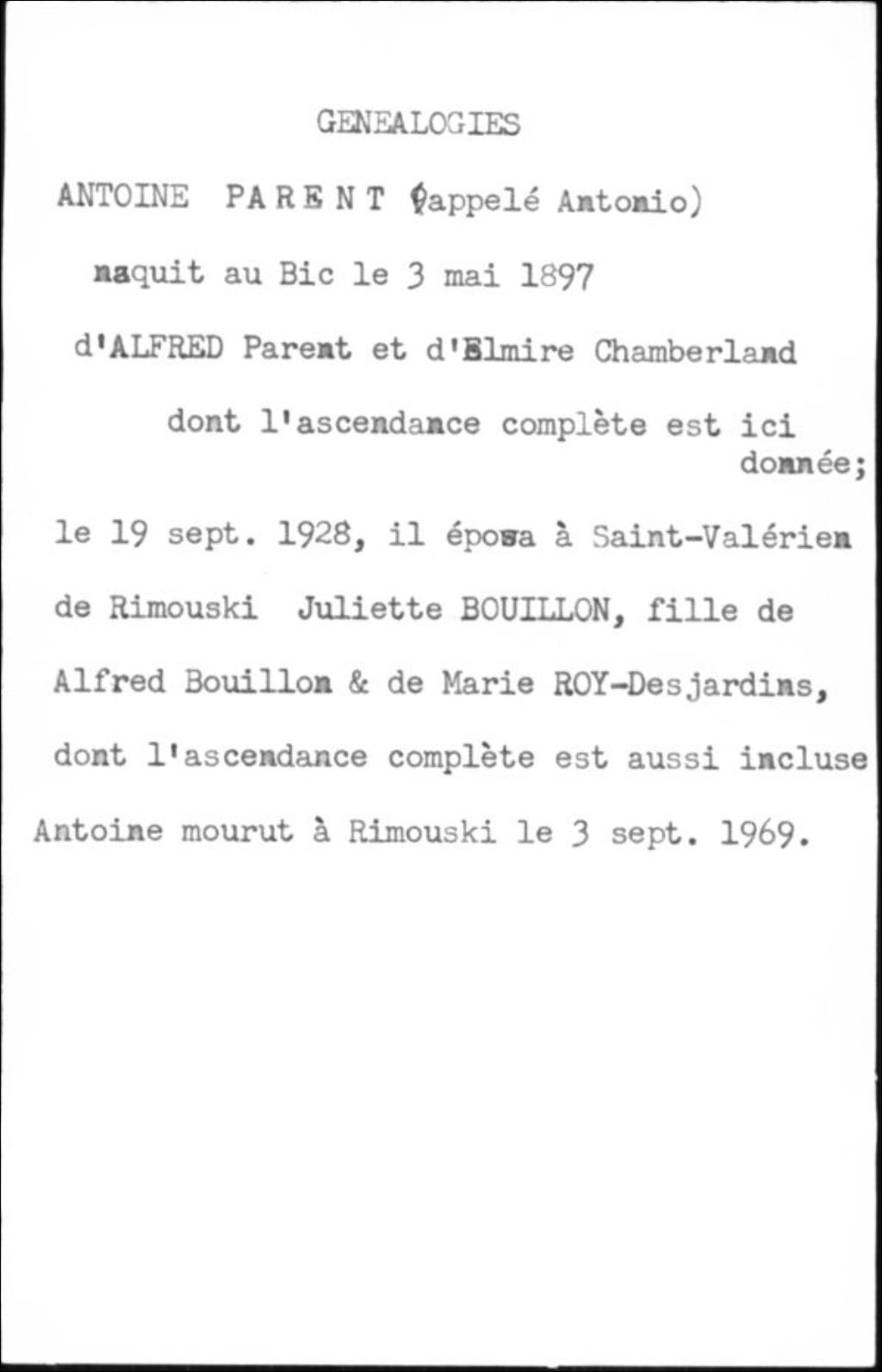 - Ce dossier contient deux documents faisant l'ascendance de la famille Antoine Parent, du Bic, ces documents couvrent une période allant de 1616 à 1855 et fiche biographique concernant Antoine Parent