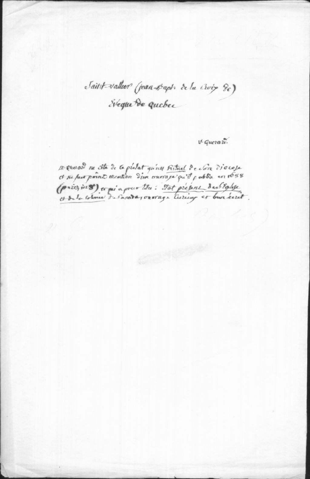 Ce dossier est constitué entre autres d'une procuration donnée par Louis Quenneville à Louis Souart le 3 novembre 1686, d'une quittance de Mgr de St-Vallier datée du 28 mars 1697 et d'une procuration donnée par le sieur d'Artigny à Gentian Renard du 9 novembre 1713. Nous retrouvons également une lettre du 1er août 1721 de Mgr de St-Vallier adressée au Révérend Père Dirop à Morlaix et portant une marque postale rarissime de La Rochelle