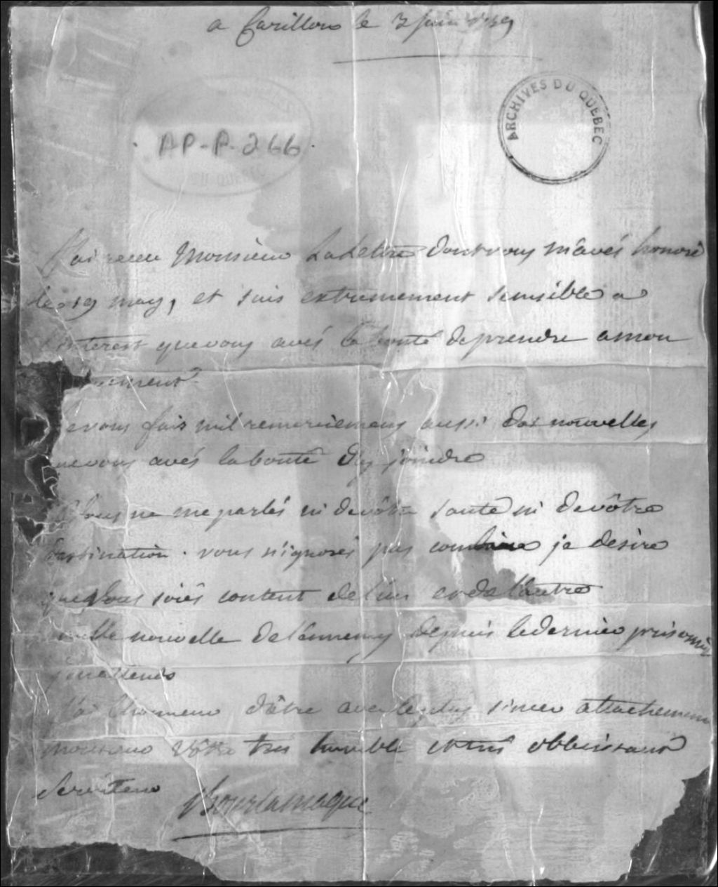 Lettre de remerciements de François-Charles de Bourlamaque, 3 juin 1759, Archives nationales à Québec, Collection Centre d'archives de Québec, (03Q,P1000,S3,D266).