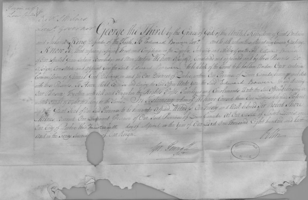 - Ce dossier est composé de quatre commissions : nominations de greffier, cour du Banc du Roi et de commissaire de Edward Bowen au district de Québec