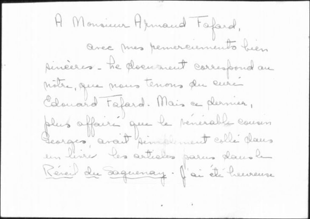 - Ce dossier comprend un cahier de 459 pages, la photocopie d'une lettre du 30 décembre 1886 adressée par le curé Fafard à Auguste Fafard de L'Islet, une note (carte) de Soeur Marie-Michel-Archange du 26 novembre 1957 adressée à Armand Fafard et, enfin, une carte mortuaire avec photographie du curé Ambroise M. Farfard.Ce journal de voyage est fait de notes ponctuelles et de longues lettres adressées au journal de Chicoutimi, « Le Réveil du Saguenay » qui les publie sous différents titres, tels « Lettre d'Europe », « Lettre de France », « Lettre de Rome ». À cet effet, l'abbé Fafard sent le besoin de faire le point auprès de ses lecteurs. De Venise, il écrit : « Lorsque j'ai consenti à passer mon journal de voyage au « Réveil du Saguenay », je n'ai pas assez réfléchi à la gravité de cette promesse, et je m'aperçois tous les jours maintenant qu'il faudrait un temps plus considérable que je puis disposer pour donner à mes récits le soin qu'il faudrait pour une correspondance rendue publique. Mais j'ose espérer [que] ceux qui liront auront assez d'indulgence pour excuser tout ce qui est dans ces lettres écrites si rapidement par lambaux, par quarts d'heures souvent au retour d'excursions fatigantes ».Il nous apparaît que le texte que nous avons en mains est une transcription, puisqu'il comprend et le texte du journal et les coupures de presse parues dans « Le Réveil du Saguenay ». De plus, il est incomplet car la dernière notation est datée de Madrid le 21 janvier 1887.Comme dans la plupart des récits de ce genre, le journal de l'abbé Fafard procède par description des étapes du voyage d'abord, puis des régions et villes visitées. Que ce soit à Londres, à Paris, à Milan, à Florence ou à Rome, il s'attarde sur la description des monuments religieux : églises, basiliques, cathédrales. Certes, il se permet de visiter certains hauts monuments profanes, pour le plaisir de ses lecteurs peut-être