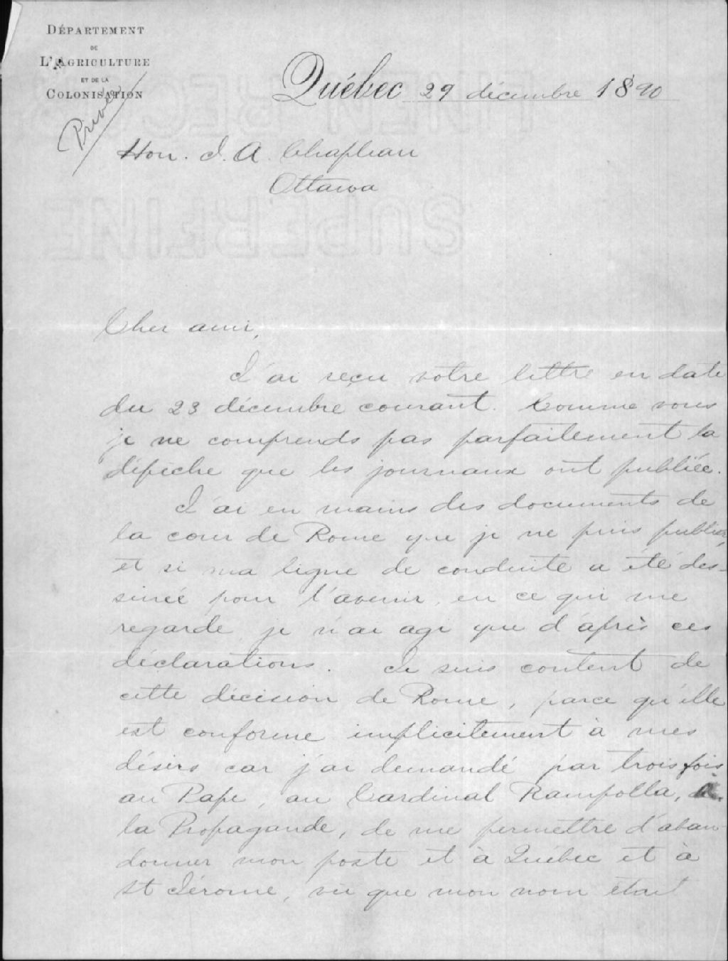 - Ce dossier contient une lettre du curé Antoine Labelle à l'honorable Joseph-Adolphe Chapleau. Datée de Québec, le 29 décembre 1890, et écrite sur le papier du Département de l'Agriculture et de la Colonisation, son contenu se rapporte au retrait de la vie politique du curé. En cela, il suit « les décrets de Rome... car autrement l'obéissance ne serait plus une vertu ». Le curé Labelle explique à mots couverts le rôle des parties dans cette affaire : celui des conservateurs, celui du premier ministre Honoré Mercier, celui de Chapleau qui « en aurait bénéficié », celui des évêques irlandais qui « veulent avoir la prédominance hiérarchique, malgré leur petit nombre... et mettre la main sur le siège d'Ottawa »