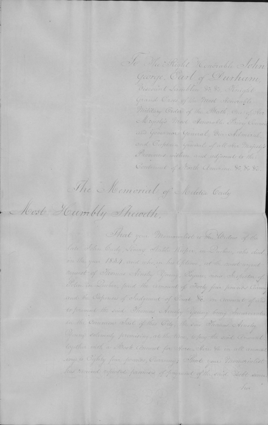 - Ce dossier comprend deux documents de grand format (dont une requête des habitants de Québec qui prend la forme d'une pétition) de même qu'un mémoire de Madame Meletia Halt, épouse de feu John Cody, adressé à Durham. Le dossier comprend également deux lettres de recommendation dont une signée par Josiah Hunt