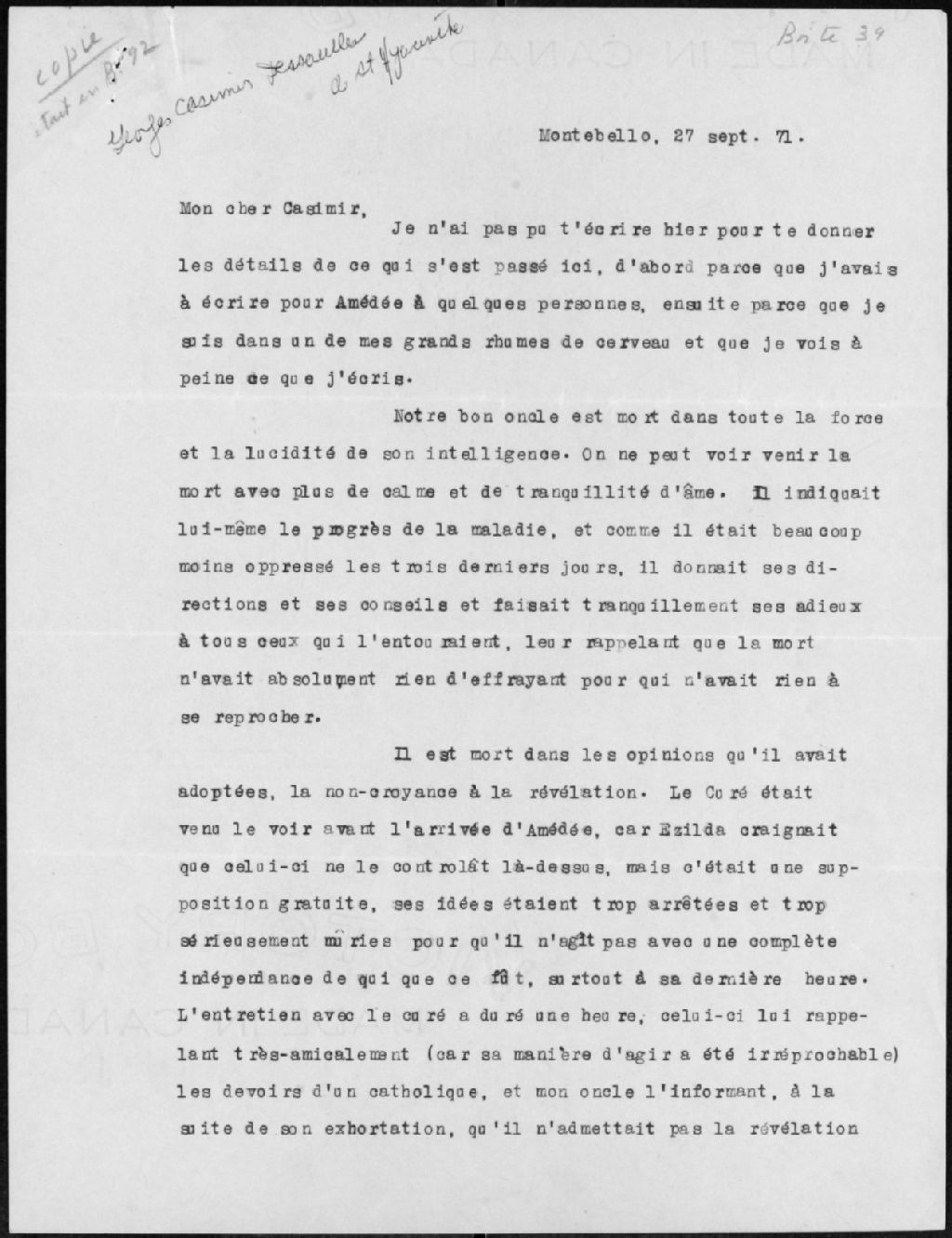 - Ce dossier contient une correspondance concernant Napoéon Bourassa et son entourage : lettres de Napoléon Bourassa à sa cousine Fanny Leman Dessaulles et à Casimir Dessaulles (1865-1909, 0,05 m), lettre de Fanny Leman Dessaulles à Napoléon Bourassa, (27 sept. 1871), trois lettres de Gustave Bourassa à sa cousine Louise (1879-1880)