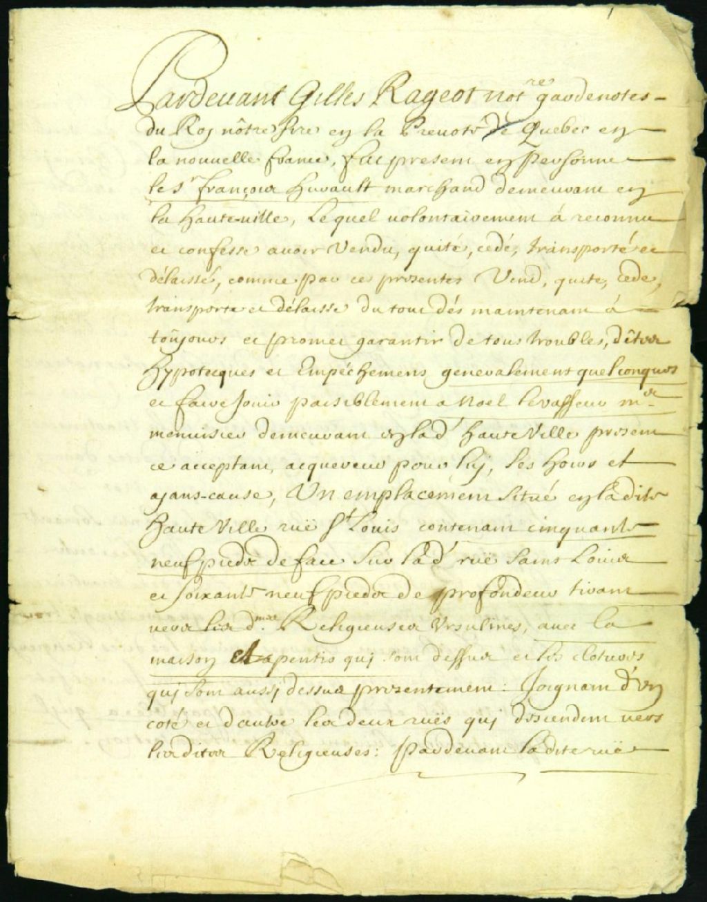 - Ce dossier contient divers actes notariés concernant les familles Levasseur, Rousselo (Laprairie), Durette, Gagnon, Taschereau, Nault, Baillairgé et Lanon. Il y a un acte de Gilles Rageot daté du 9 septembre 1691 et contre-signé par François Genaple en 1704, un acte de de Guillaume Roger du 8 septembre 1695, un acte du 5 octobre 1697 d'un notaire dénommé Berrer (Berzer ?), un acte de Chambalon du 12 juin 1700, un testament de M. Durette datant de 1833, deux renonociations concernant Ernest Gagnon (1887), Hélène Landry et Jules Taschereau (1887) par le notaire L. P. Sirois, une déclaration d'hérédité entre Amélie Nault et Caroline Durette de 1889, un acte du notaire Joseph Desautels de 1889, un contrat de vente entre Amélie Nault et L. G. Baillairgé de 1889 (Sirois), un contrat de vente entre J.-F. Baillairgé et William D. Baillairgé de 1896 (Sirois), un certificat d'enregistrement à l'ordre de L. P. Sirois pour un lot de terre fait en 1896 possédé par les héritiers de J.-F. Baillairgé
