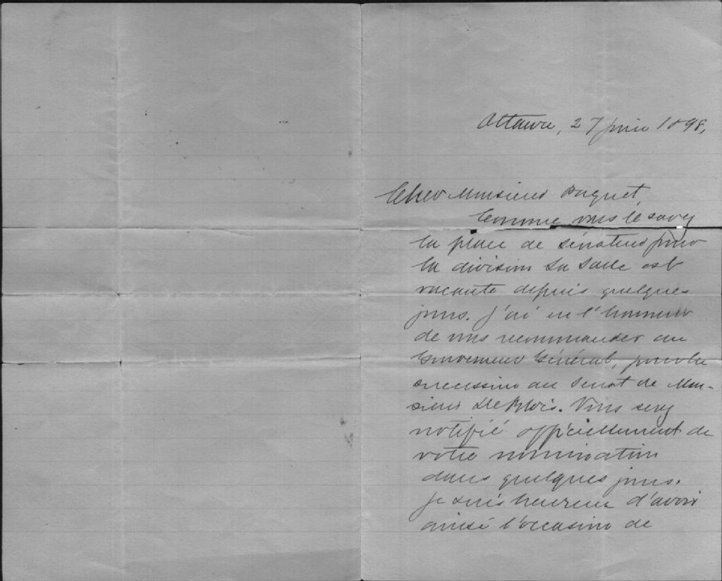 Ce dossier est composé d'une lettre datée du 27 juin 1898 de Sir Wilfrid Laurier, alors premier ministre du Canada, avisant informellement Joseph-Arthur Paquet de sa nomination au Sénat du Canada et la confirmation officielle de cette nomination le 28 juin par le greffier du Gouvernement du Canada