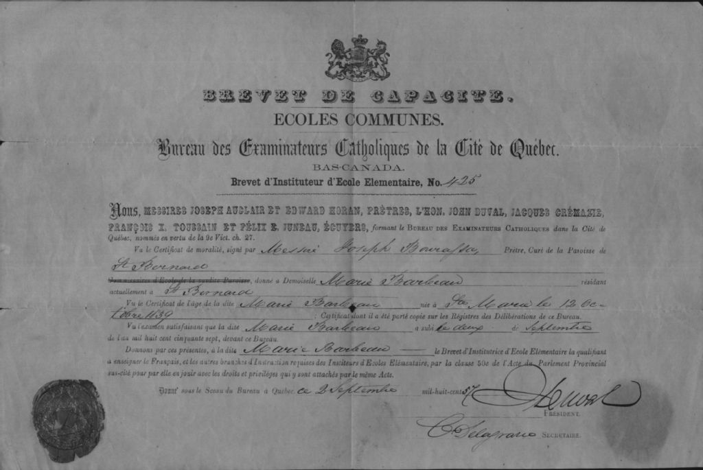 Brevet d'instituteur accordé à Marie Barbeau, 2 septembre 1857, Archives nationales à Québec, Collection Centre d'archives de Québec, (03Q,P1000,S3,D2816).