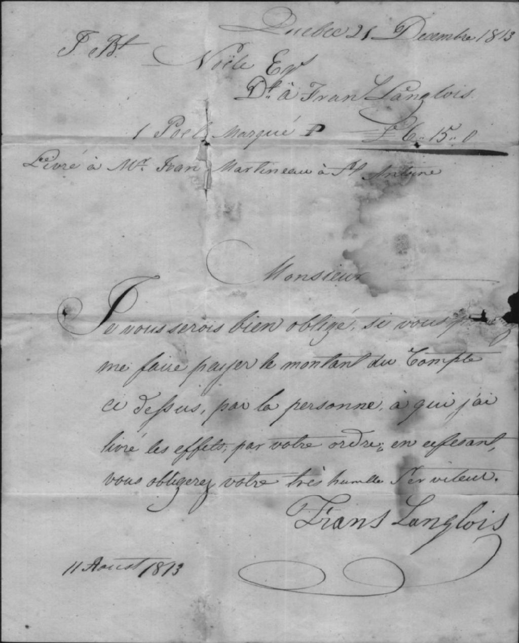 Achat d'un poêle par Jean Martineau, 11 août 1813-25 décembre 1813, Archives nationales à Québec, Collection Centre d'archives de Québec, (03Q,P1000,S3,D2821).