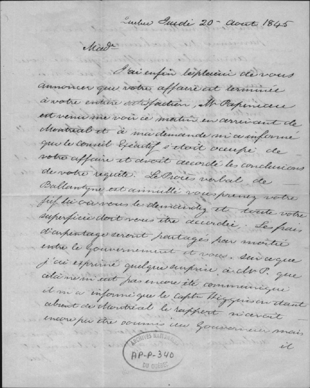 Lettres envoyées à madame Thomas Casault, 1845-1853, Archives nationales à Québec, Collection Centre d'archives de Québec, (03Q,P1000,S3,D2827).
