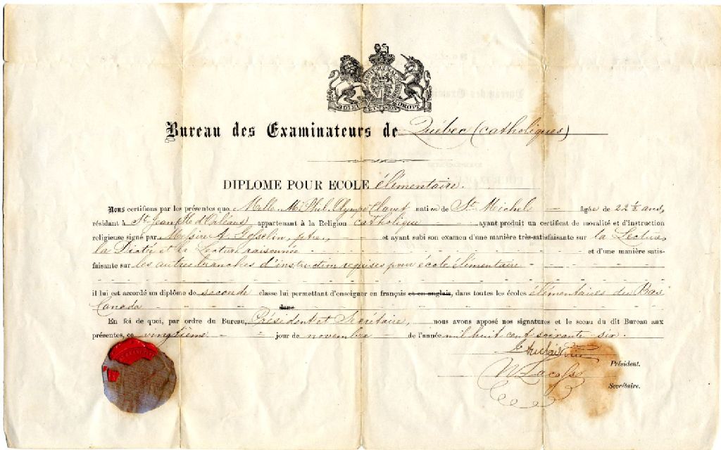 Diplôme et contrat d'enseignantes de niveau élémentaire, 1866-1896, Archives nationales à Québec, Collection Centre d'archives de Québec, (03Q,P1000,S3,D2838).