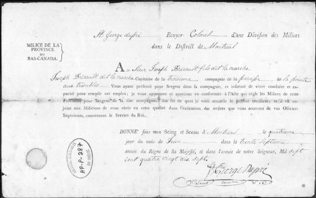 Ce dossier est composé d'une commission pour Joseph Bricault dit Lamarche: sergent 3e compagnie de milice, Pointe-aux-Trembles, signée St-Georges Dupré