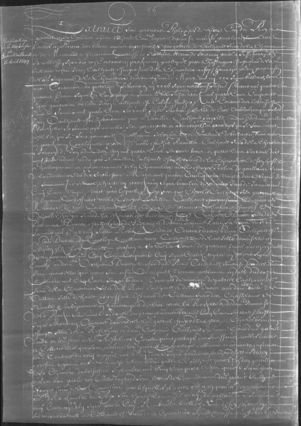 Confirmation de la noblesse de Gabriel Cailhaut, 15 avril 1599, Archives nationales à Québec, Collection Centre d'archives de Québec, (03Q,P1000,S3,D304).