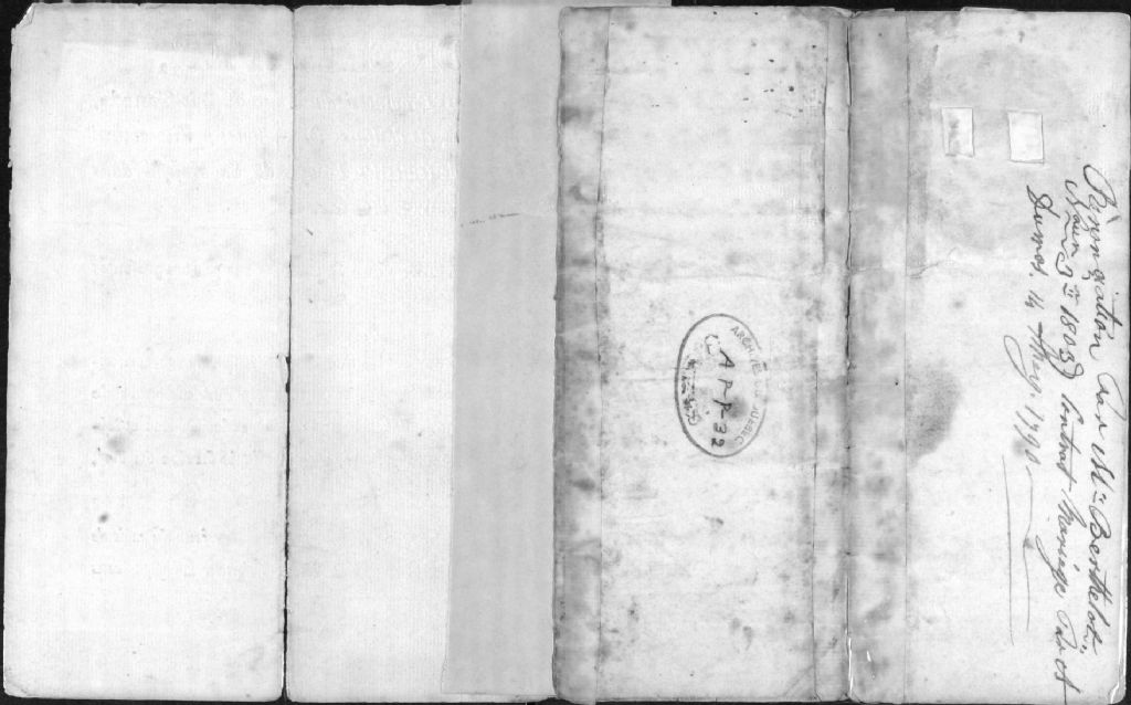 Brevet de capitaine de Jean-Baptiste Amiot, renonciation d'un contrat de mariage entre les familles Berthelot et Dumas, 14 mai 1790, 21 septembre 1794 et 1803, Archives nationales à Québec, Collection Centre d'archives de Québec, (03Q,P1000,S3,D32).