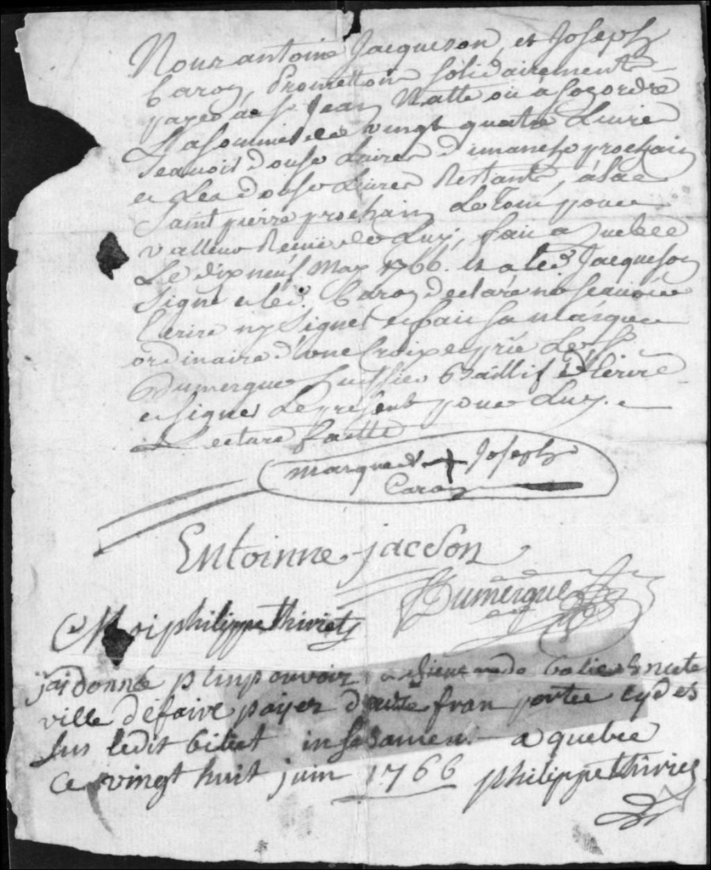 Documents concernant Joseph Caron, 19 mai 1766 - 16 août 1766, Archives nationales à Québec, Collection Centre d'archives de Québec, (03Q,P1000,S3,D325).