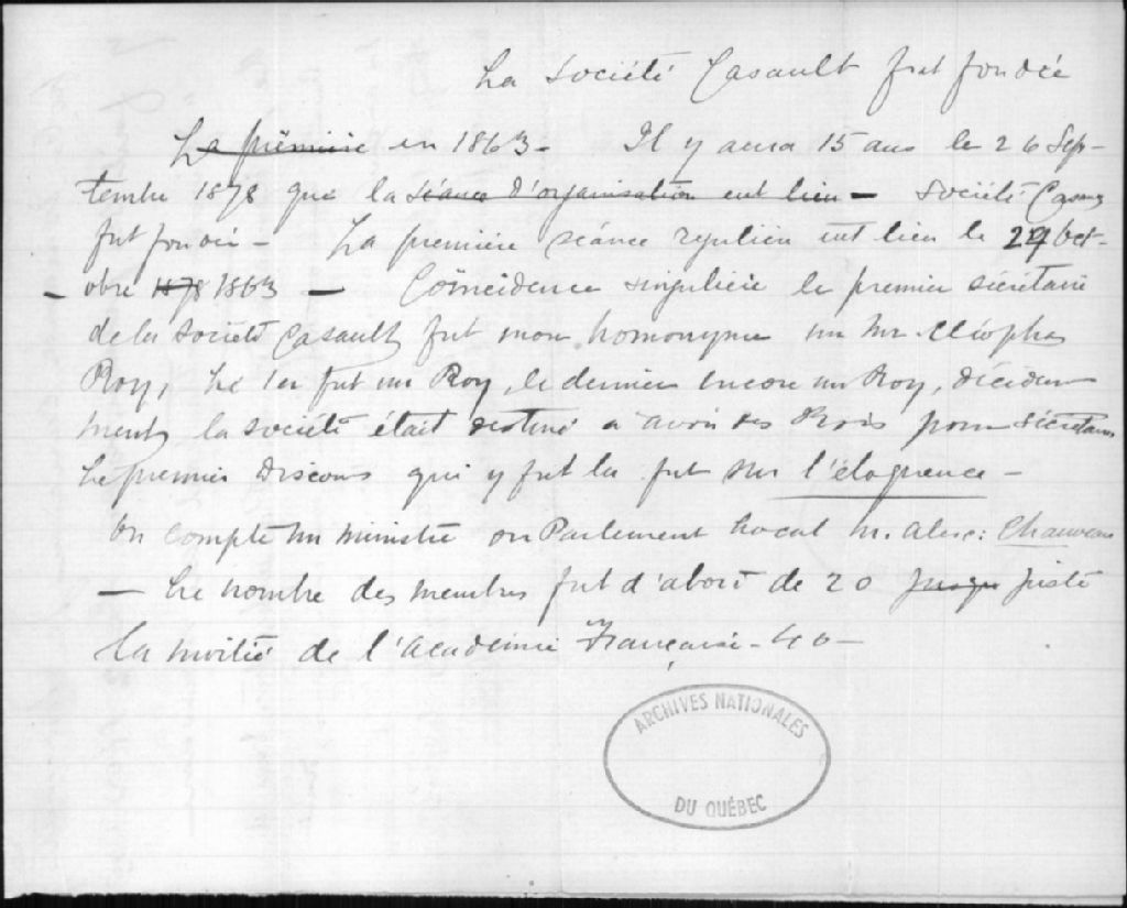 Document concernant le progrès de la Société Casault, 14 janvier 1877, Archives nationales à Québec, Collection Centre d'archives de Québec, (03Q,P1000,S3,D339).