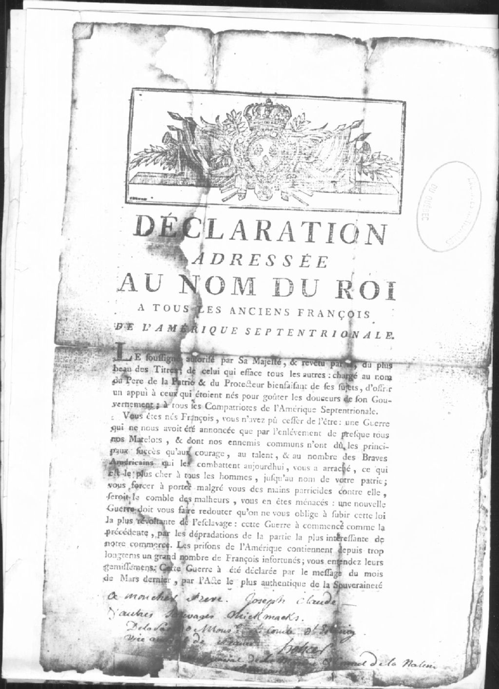 Ce dossier est composé d'une déclaration demandant aux "anciens françois" de l'Amérique d'assister les colonies anglaises révoltées, signée du nom de l'amiral d'Estaing et adressée à Joseph Claude, chez des Micmacs, à Restigouche. La tradition orale voulait que cette lettre fut de Washington (photostat). Note explicative du R.P. Placide, o.f.m. Ce documents se retrouva affiché dans plusieurs villages du Québec en 1778 alors que le comte d'Estaing les avaient imprimé à bord de son vaisseau le Languedoc pendant qu'il était en rade de Boston
