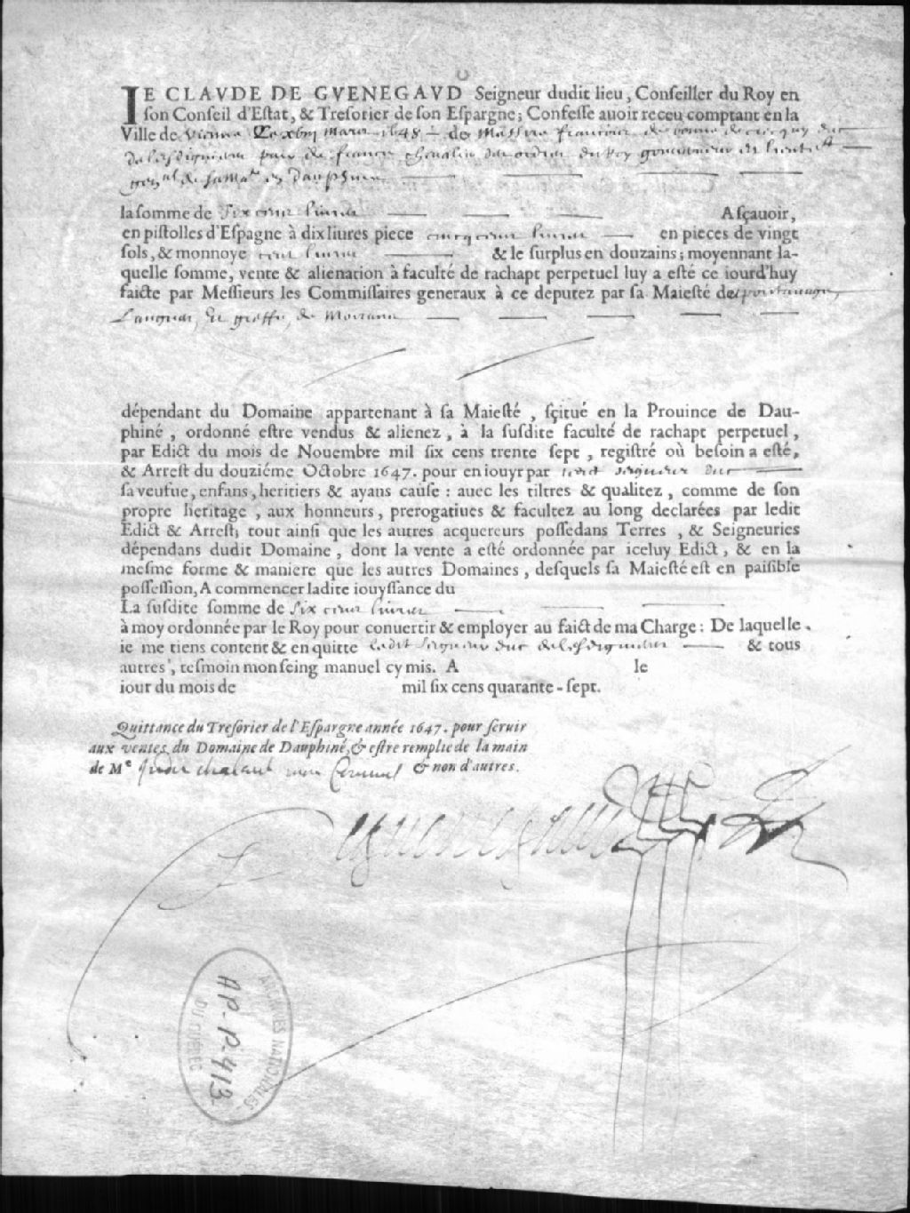 - Ce dossier est composé d'une pièce sur parchemin signée par Claude de Guenegaud, 1647, avec signature de Colbert et d'une profession de foi catholique et promesse de fidélité au roi et à son devoir d'état, 11 fév. 1675, aussi signé par Colbert (photostat et copie dactylographiée)