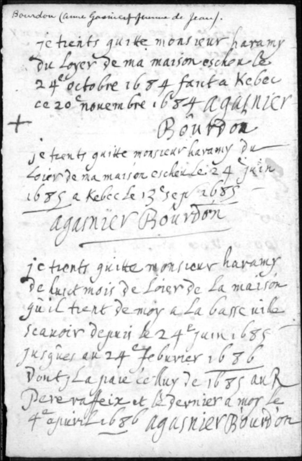 - Ce dossier est composé de neuf quittances comprises sur deux documents textuels par Anne Gasnier Bourdon à M. et Mme Aramy, 1683-1686; deux reçus de M. Jean Aramy, 1684 et 1685 compris sur un seul document textuel; compte de Mme Aramy envers M. Dombourg, 11 nov. 1689; lettre, écrite à Plaisance (T.-N.), de M. Pierre Aramy à sa mère où il est question de Pierre Lemoyne d'Iberville (qui est en retard à Plaisance), 8 juin 1696; deux connaissements donnés à la veuve Thomas Aramy l'un par le capitaine Alain Durand (il s'agit d'un photostat), à La Rochelle, 21 avril 1683, l'autre par le capitaine Dombourg, à La Rochelle, 7 juin 1689