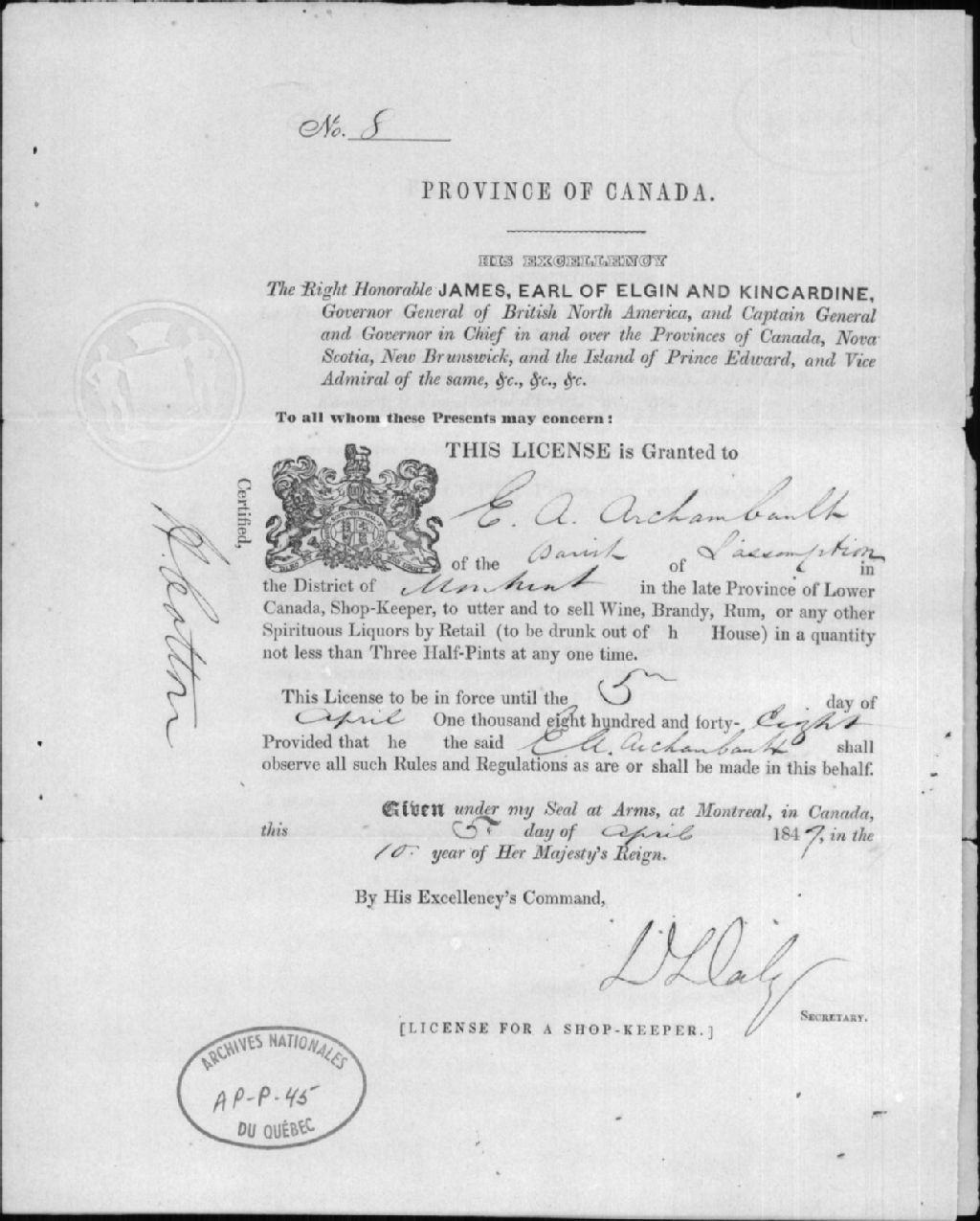 - Ce dossier est composé d'une licence émise à E.-A. Archambault sous l'autorité de Lord Elgin et signée par D. Daly pour la vente d'alcools en 1848, une copie en français a aussi été émise