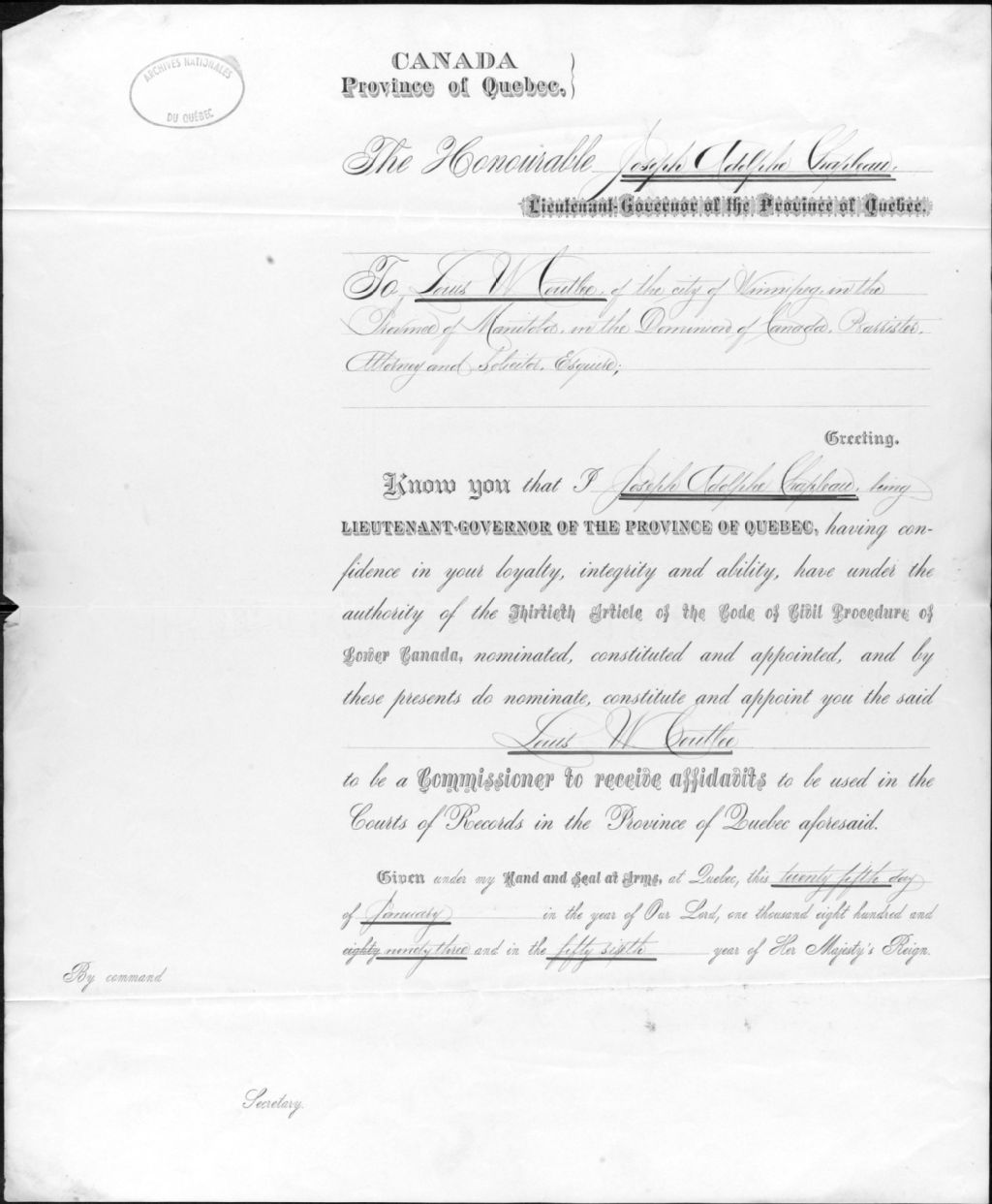 Nomination de Louis-W. Coutlee comme commissaire, 25 janvier 1893, Archives nationales à Québec, Collection Centre d'archives de Québec, (03Q,P1000,S3,D451).