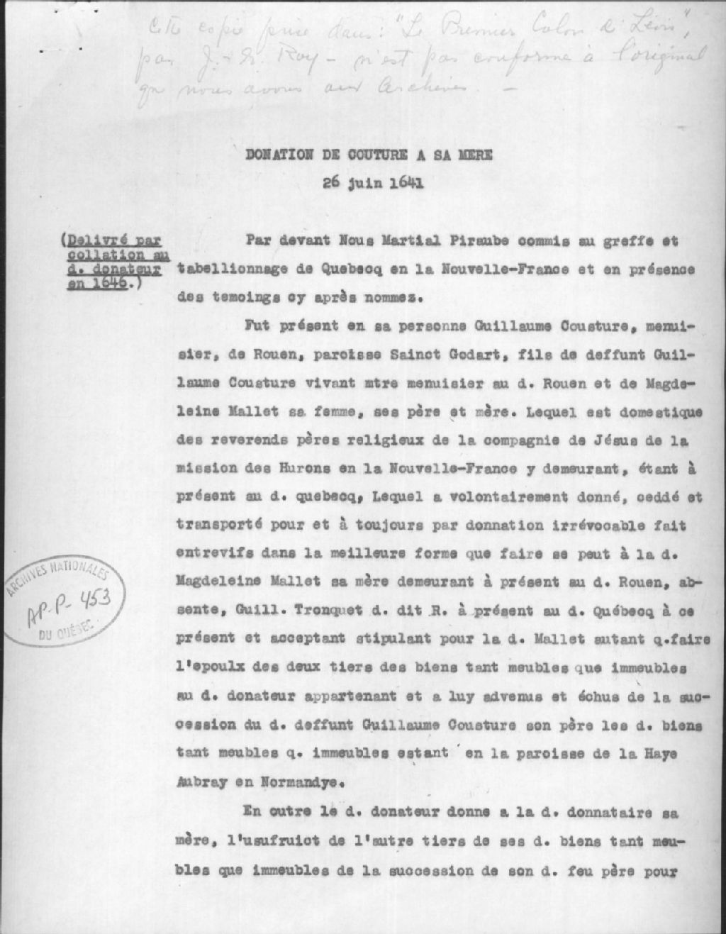 - Ce dossier est composé des documents suivants: dépôt d'une concession de terre par le gouverneur Charles Huault de Montmagny à Guillaume Couture (1617-1702), 1790 (photostat et copie dactylographiée); concession de terre par le gouverneur Charles Huault de Montmagny à Guillaume Couture (1617-1702) (photostat); donation de Guillaume Couture à sa mère Magdeleine Mallet, devant le notaire Piraube (photostat et copies dactylographiées)