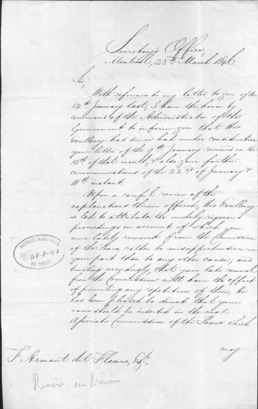 - Ce dossier est composé de 7 lettres entre le Secrétariat de la province et François Armant dit Flamme concernant sa démission comme juge de paix. Aussi deux pétitions des habitants de la Rivière-des-Prairies demandant la suspension d'Armant comme magistrat. Il existe un dossier sur cette affaire dans la série touchant les juges de paix dans le fonds Secrétariat de la province (E4)
