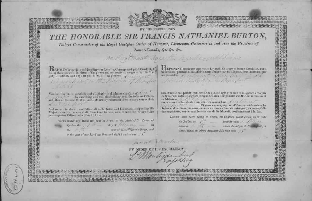 Nominations d'Augustin Deguise, 18 juin 1806 et 1 février 1825, Archives nationales à Québec, Collection Centre d'archives de Québec, (03Q,P1000,S3,D514).