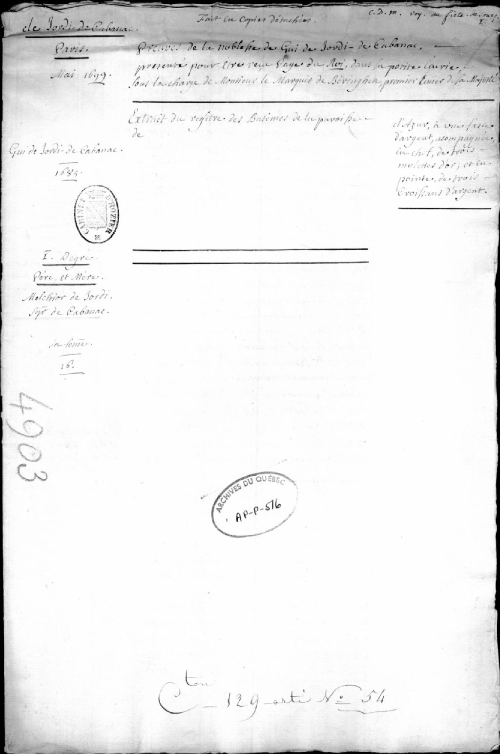Ce dossier est composé des documents suivants; preuves de la noblesse de Guy de Jordy de Cabanac, 1703 (photostats et copies manuscrites); notes sur la famille, 1549-1699; extraits de registres de baptême, mariage, sépulture; notes de P.-G. Roy. Dejordy de Cabanac et Vachon, prêtre, certifient l'échange d'un cheval entre Jean La Buaste (LA Buasle) et le sieur Jorian, 1725