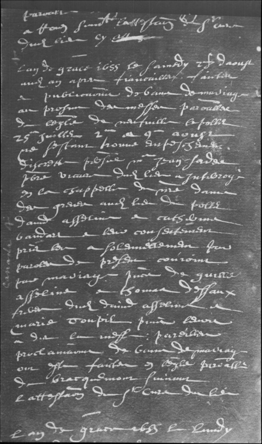 Acte de mariage de David Asselin et de Catherine Beaudard, 28 août 1655, Archives nationales à Québec, Collection Centre d'archives de Québec, (03Q,P1000,S3,D52).