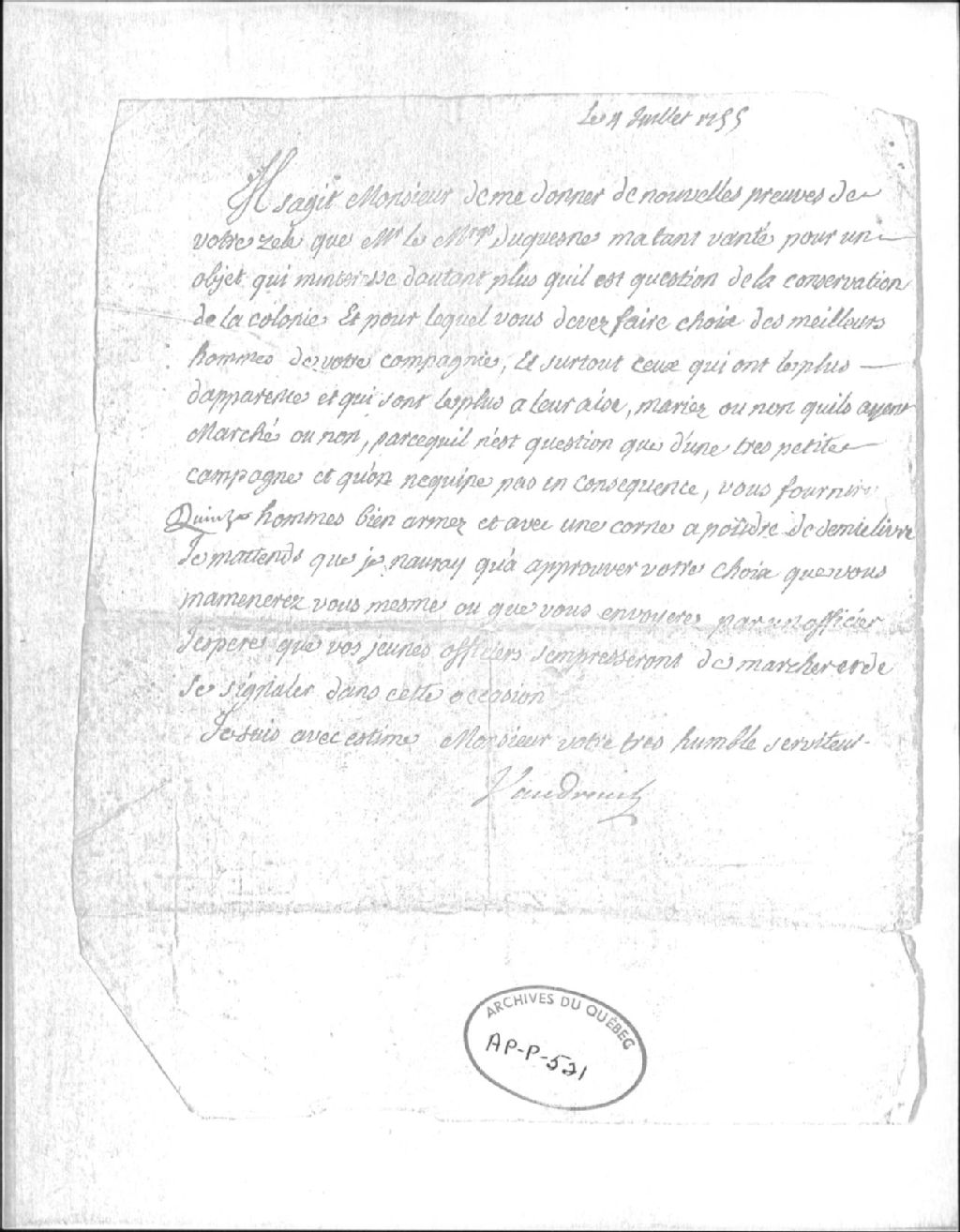 Documents concernant Augustin Delisle et le marquis de Vaudreuil, 28 avril 1738 - 10 octobre 1755, Archives nationales à Québec, Collection Centre d'archives de Québec, (03Q,P1000,S3,D521).