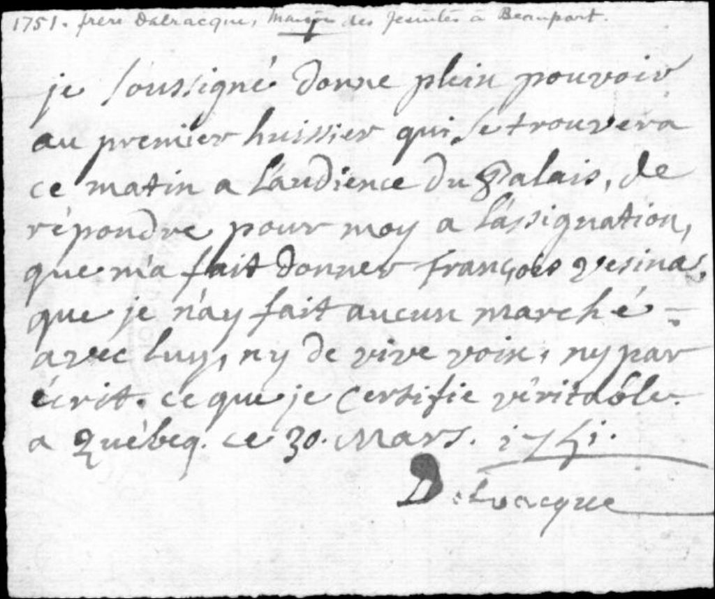 - Ce dossier est composé d'une procuration de Delvacque au premier huissier qui se trouvera à l'audience pour répondre à l'assignation de François Vézina (le soussigné n'a fait aucun marché avec François Vézina), d'un billet promissoire de Charles Levasseur et d'une signification du billet par l'huissier Cheval