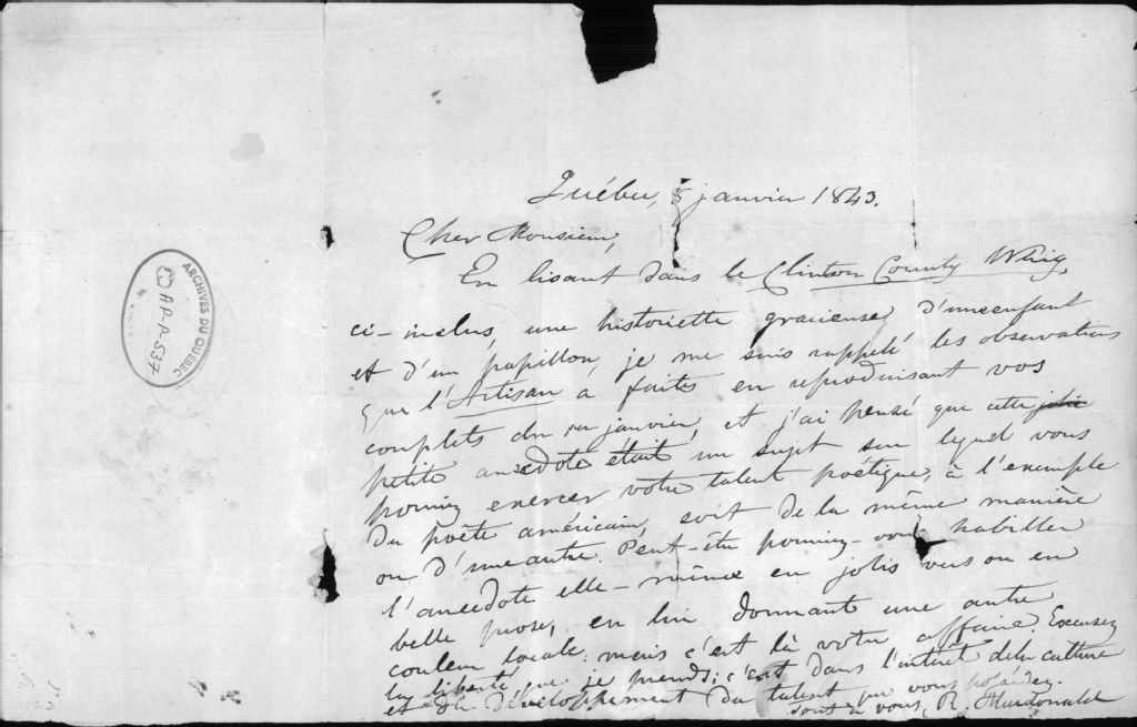 - Ce dossier est constitué de deux lettres : l'une, datée de septembre 1836, de Joseph Cauchon à François Dérome dans laquelle il explique qu'il a fait sa commission, que Chabot le recevra avec plaisir, parle de son voyage sur la Côte Nord, etc.; l'autre, datée de 1843, de Ronald Macdonald où il lui parle de son talent poétique et lui envoie une historiette à mettre en vers ou en prose