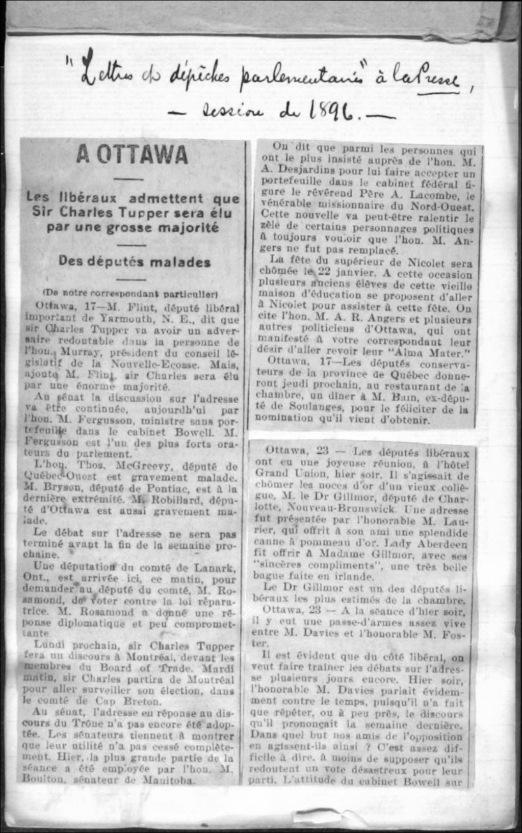 Ce dossier est constitué de coupures de journaux sous forme de lettres et dépêches d'Ottawa, concernant les débats parlementaires de 1895 et 1896 ainsi que des lettres de voyage sous forme de coupures de journaux publiées en 1890. On y trouve également deux lettres du banquier P.-E. Panneton et d'Hector-L. Langevin en 1900, une lettre et un télégramme de A.-R. Angers en 1896