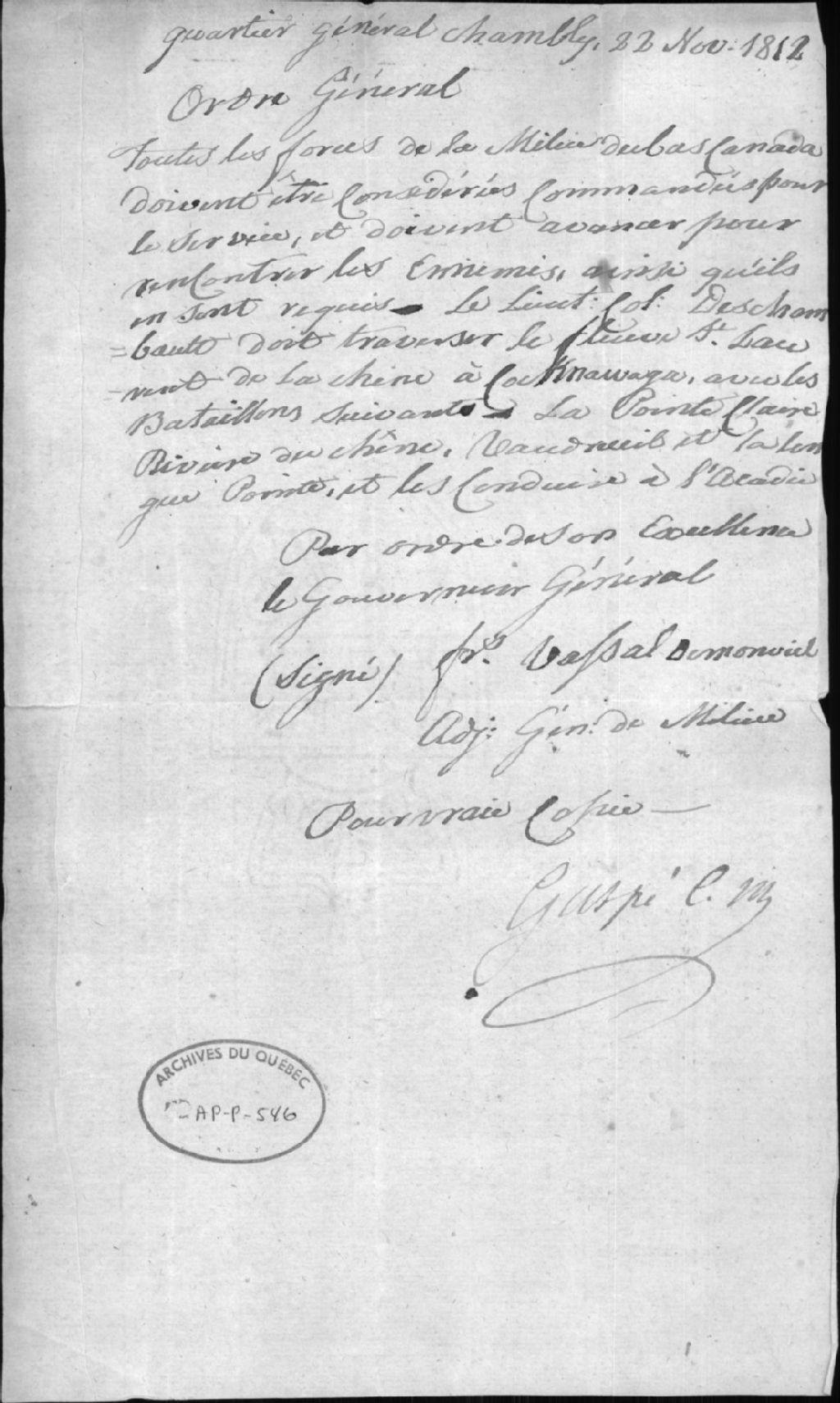 Ordre donné par F. Vassal de Monviel au Lieutenant-colonel Deschambault, 22 novembre 1812, Archives nationales à Québec, Collection Centre d'archives de Québec, (03Q,P1000,S3,D546).