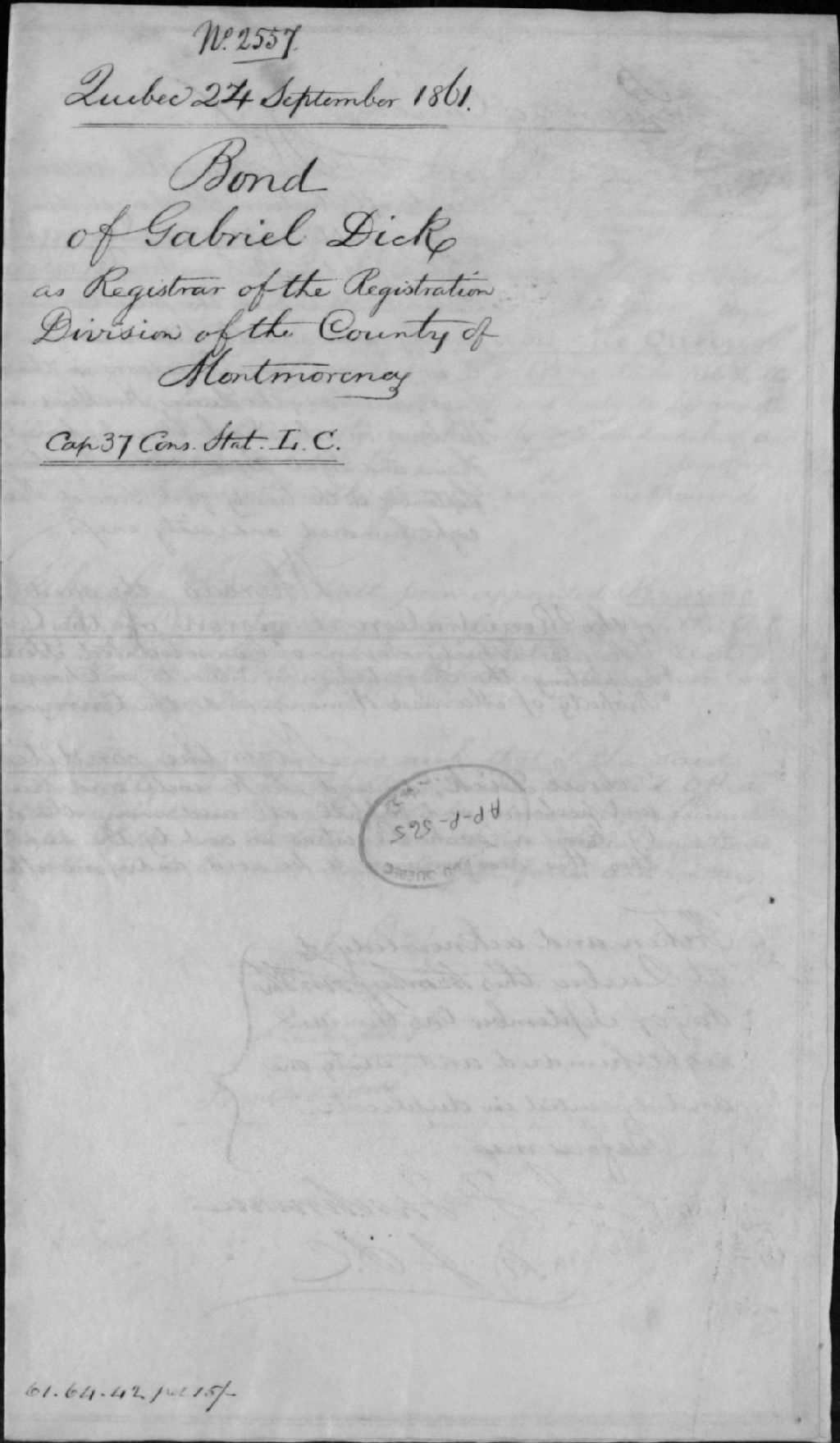 Documents concernant Gabriel Dick, 24 septembre 1861, Archives nationales à Québec, Collection Centre d'archives de Québec, (03Q,P1000,S3,D565).