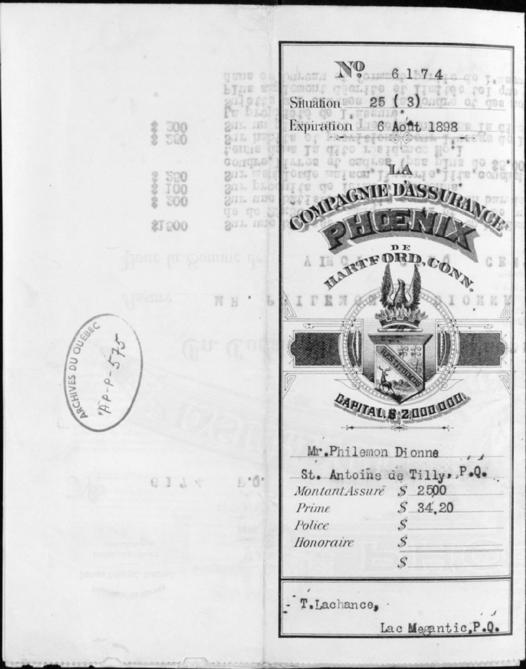 - Ce dossier comprend les documents suivants: trois polices d'assurance. Une lettre de H. Guimont au sujet des assurances. Avis donné à Philémon Dionne, Wilbrod Croteau, Zotique Beaudet et Rémi Desrochers que F.-X. Fafard se rendra en la paroisse St-Antoine de Tilly procéder au tracé de la ligne et au posage des bornes de la manière ordonnée par la Cour. Lettre d'Arthur Dionne concernant l'audition des livres de rentes et des différends de famille. Adolphe Marchand reconnaît avoir reçu de madame Dionne une somme d'argent pour achat d'un cheval