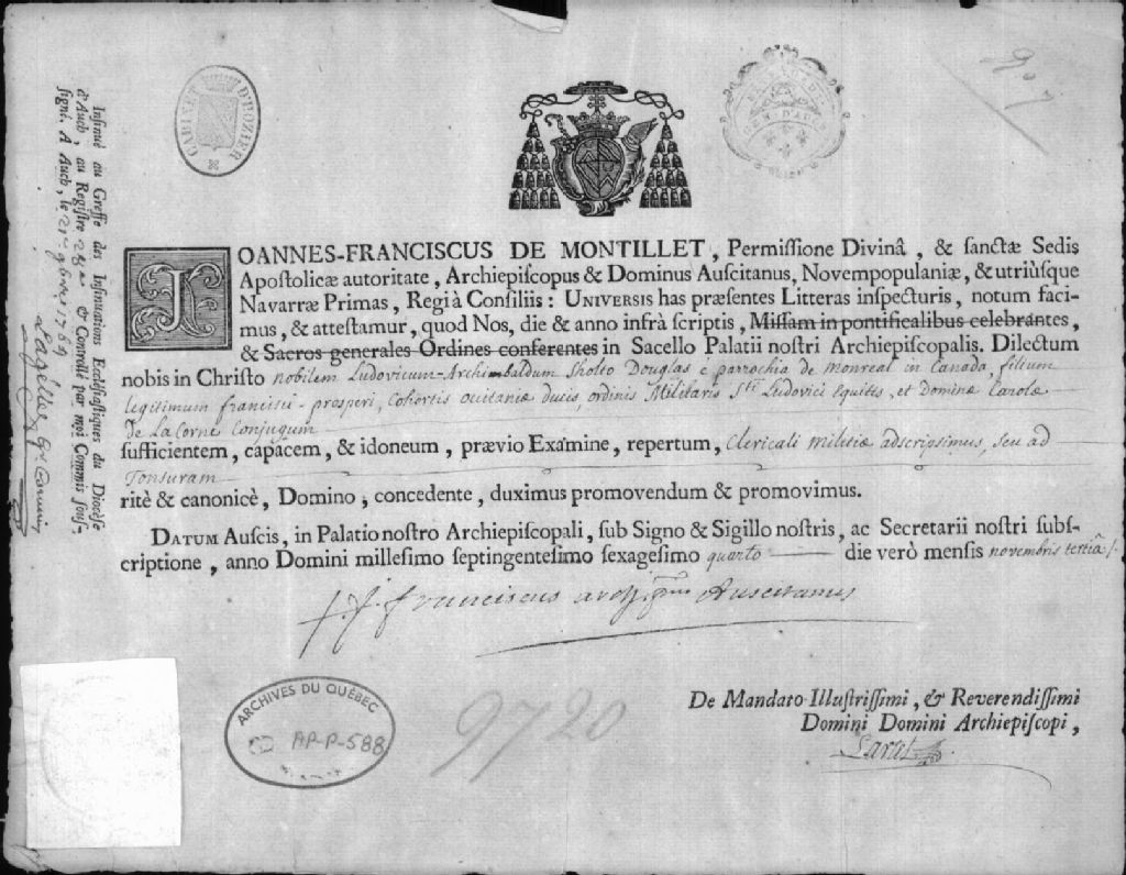 Document concernant Louis Archibald Sholto Douglas, 3 novembre 1764, Archives nationales à Québec, Collection Centre d'archives de Québec, (03Q,P1000,S3,D588).