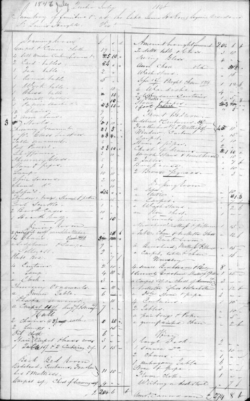 Inventaire du mobilier de James Ackens, Juillet 1846, Archives nationales à Québec, Collection Centre d'archives de Québec, (03Q,P1000,S3,D6).