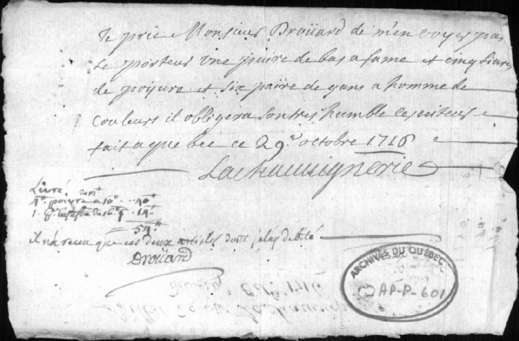 - Ce dossier contient un billet de M. Lachauvignerie demandant à Drouard de lui envoyer certains effets. Et un autre dans lequel Page donne pouvoir à Drouard de comparaître pour donner son consentement à la nomination d'un arbitre pour lequel le sieur Gosselin a fait sa soumission au Conseil