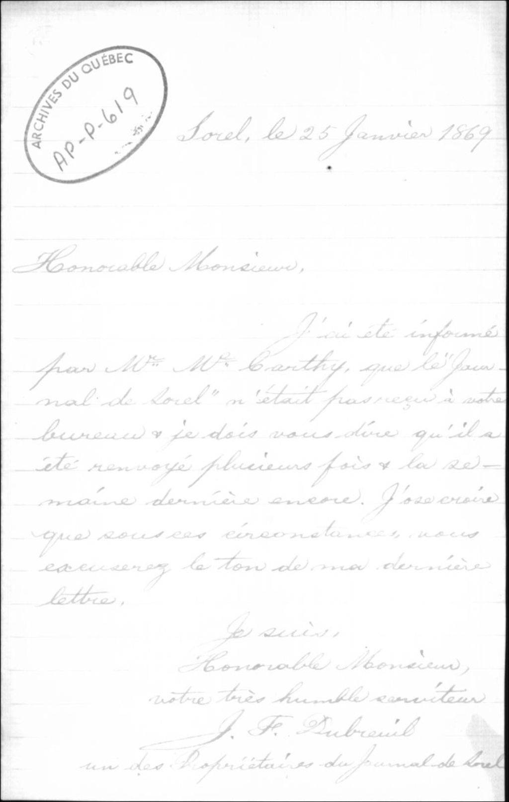 Ce dossier contient une lettre dans laquelle Dubreuil signifie qu'il a été informé par McCarthy qu'on ne recevait pas le «Journal de Sorel» et qu'il avait été renvoyé plusieurs fois; il s'excuse aussi du ton de sa dernière lettre