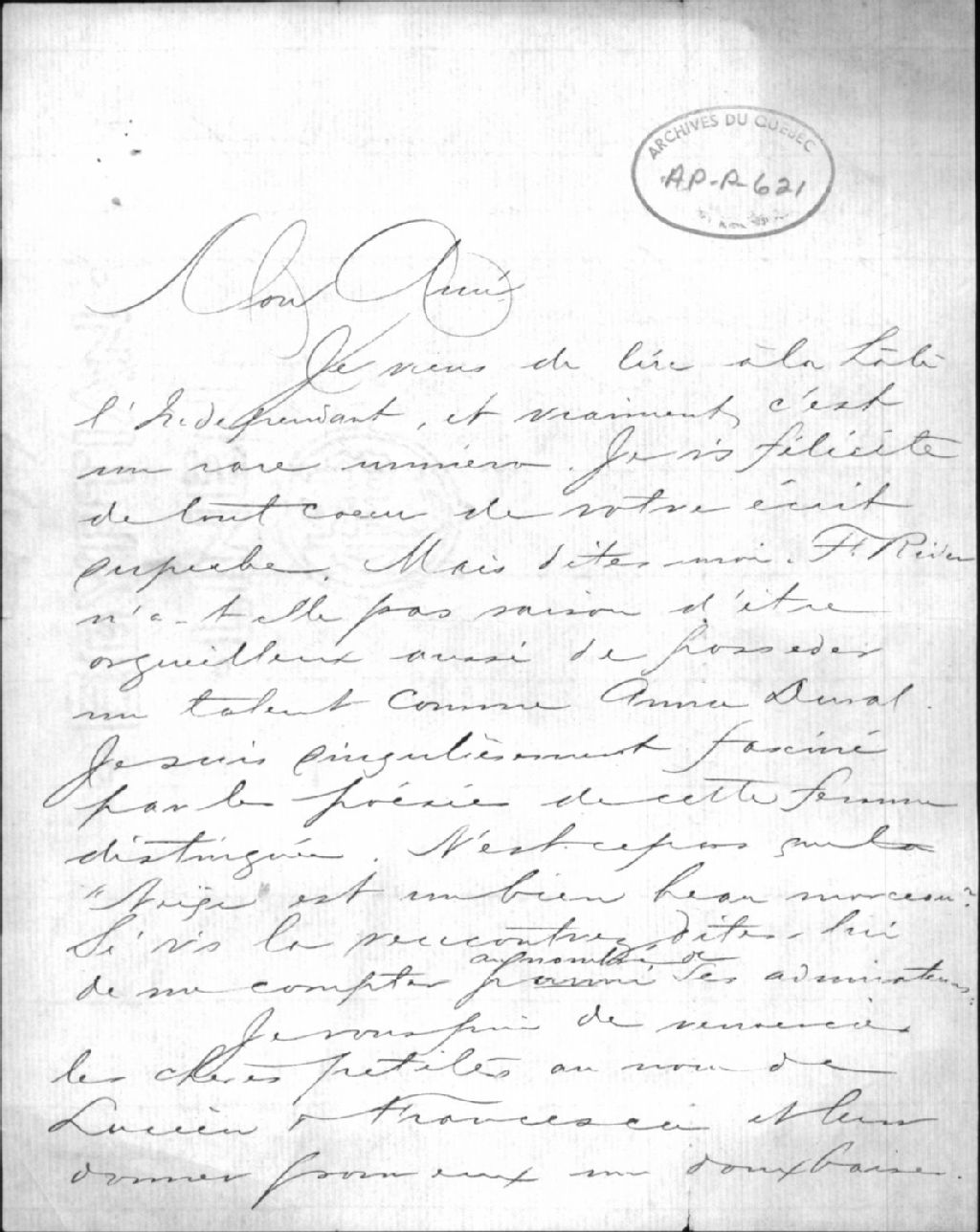 - Ce dossier est composé de deux lettres, d'une carte et d'une enveloppe de A.-J. Pothier à l'hon. H.-A. Dubuque (1854-1928) dans lesquelles il est question du journal «L'indépendant», d'articles littéraires et de la poésie de la poète Anne Duval