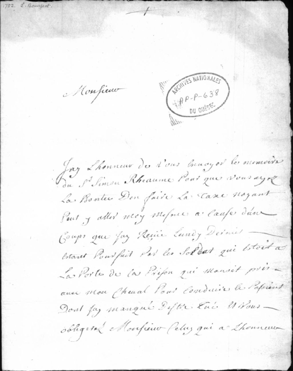 Documents concernant Christophe-Hilarion Dulaurent,M. Bourgeot, M. Jaillard et Simon Rhéaume, 2 juin 1752-7 août 1753, Archives nationales à Québec, Collection Centre d'archives de Québec, (03Q,P1000,S3,D638).