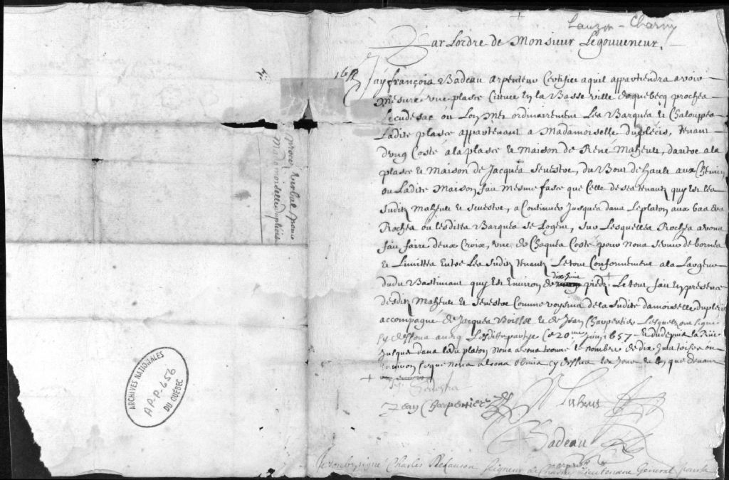- Ce dossier contient le procès-verbal d'arpentage et de mesurage avec signatures d'une place sise en la Basse-Ville de Québec proche d'un cul de sac, par François Badeau en mai 1657. Charles de Lauzon certifie avoir donné cet emplacement à Mlle Duplessis en septembre de la même année