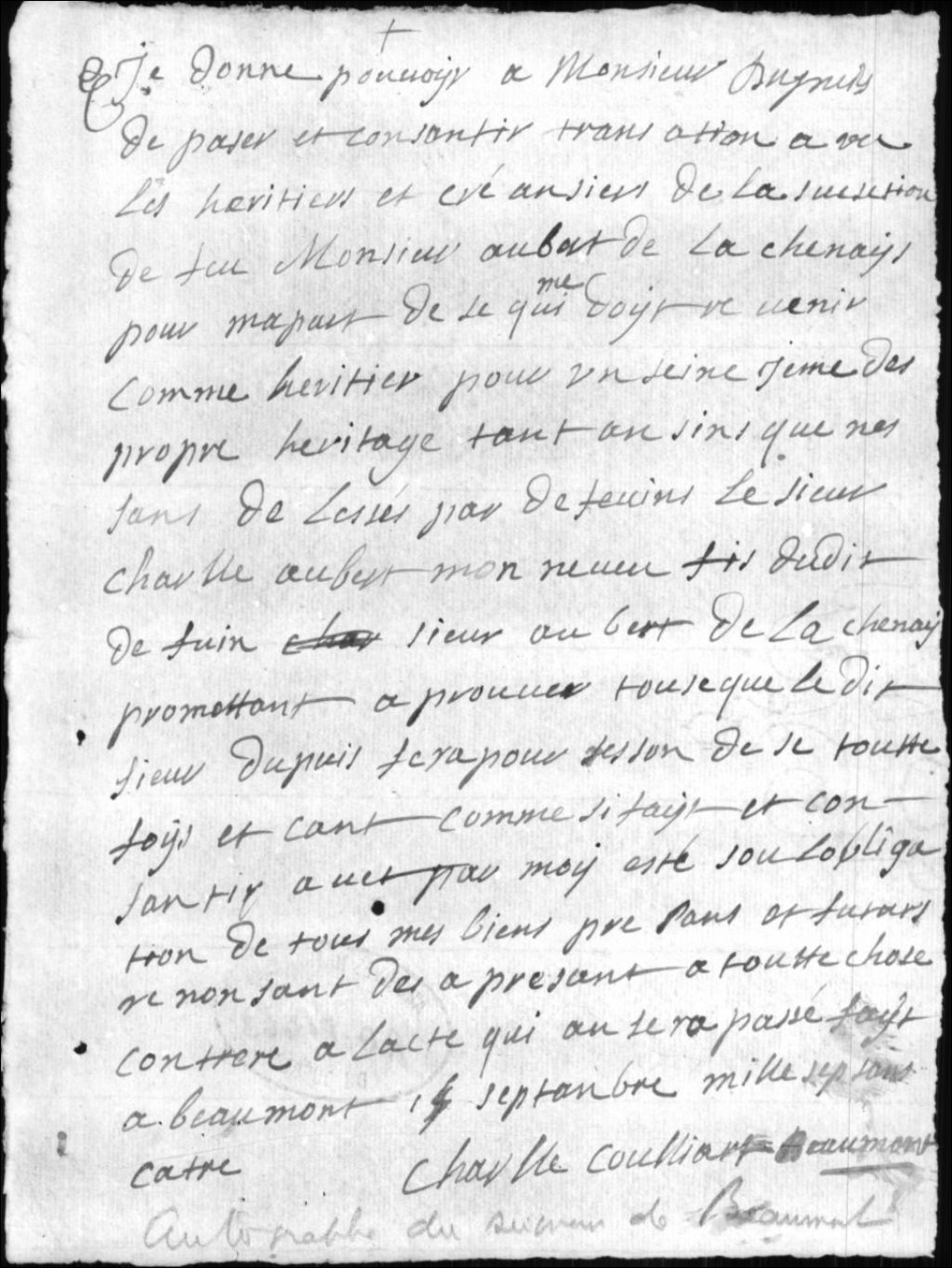 Procuration de Charles Couillard de Beaumont au Sieur Dupuis concernant la sucession d'Aubert de La Chesnaye, 14 septembre 1704, Archives nationales à Québec, Collection Centre d'archives de Québec, (03Q,P1000,S3,D663).