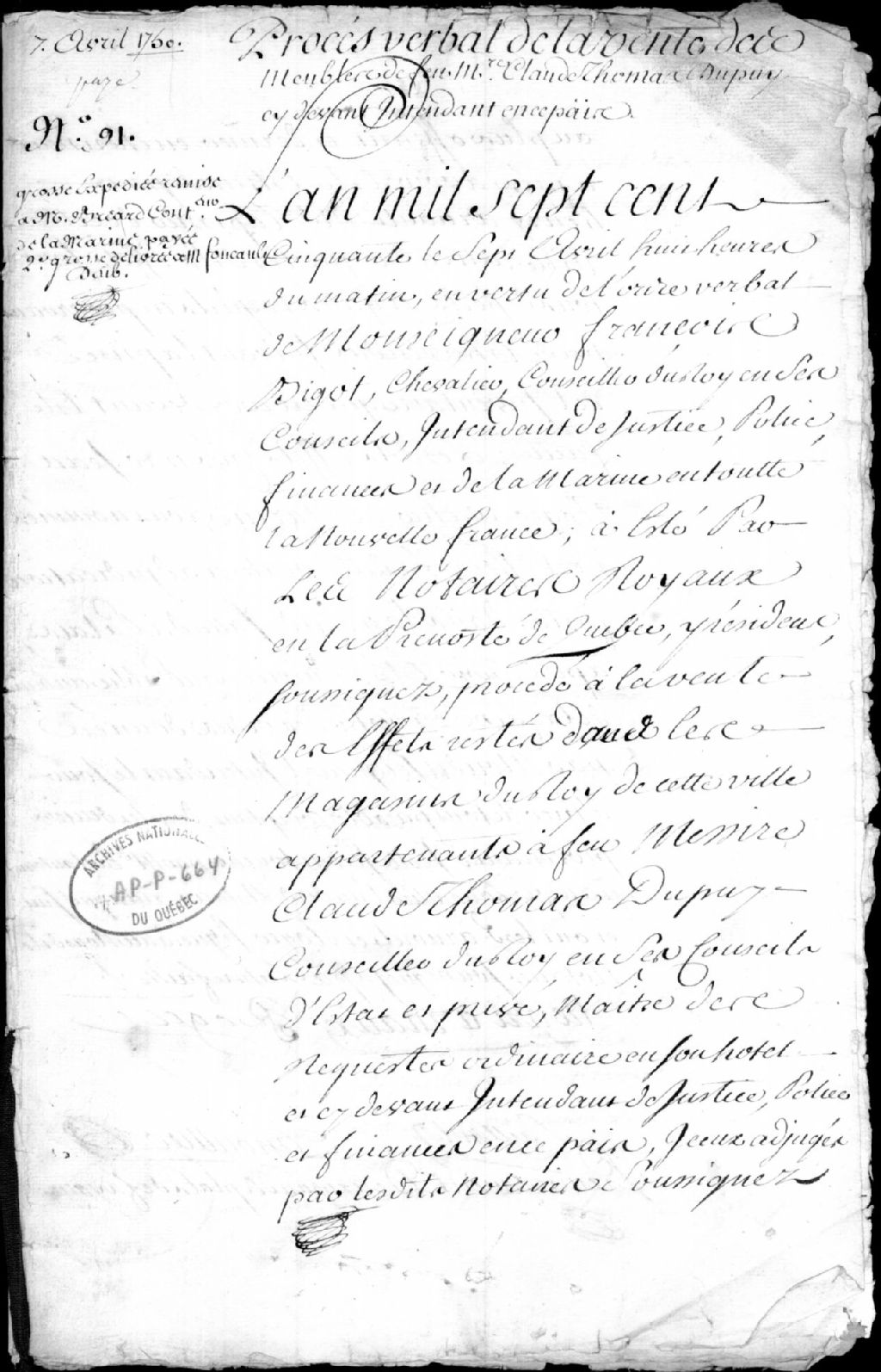 - Ce dossier est constitué de la copie manuscrite du procès-verbal de la vente des meubles de feu l'intendant Claude-Thomas Dupuy: Perrault certifie avoir reçu de Lanouiller le prix de la vente des meubles de Dupuy