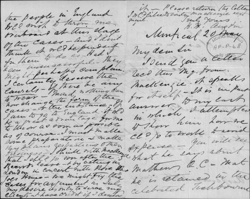 - Lettre de H. R. Austin concernant Antoine-Aimé Dorion et Alexander Mackenzie