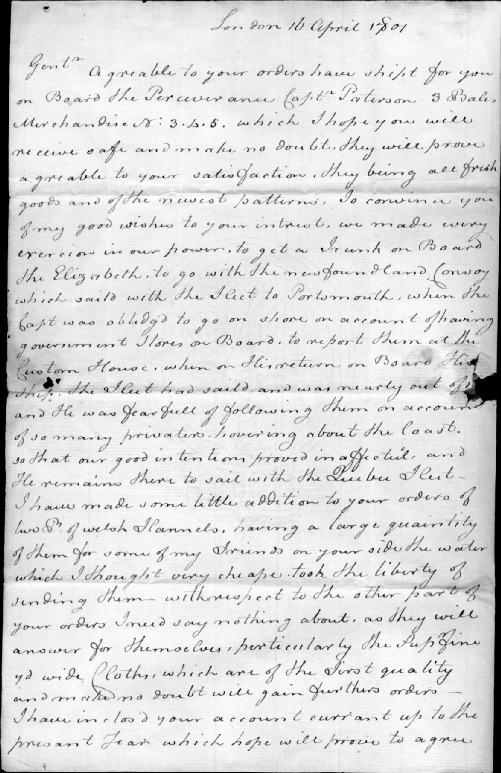 - Lettre de J. Lermith au sujet de marchandises expédiées de Londres à Québec